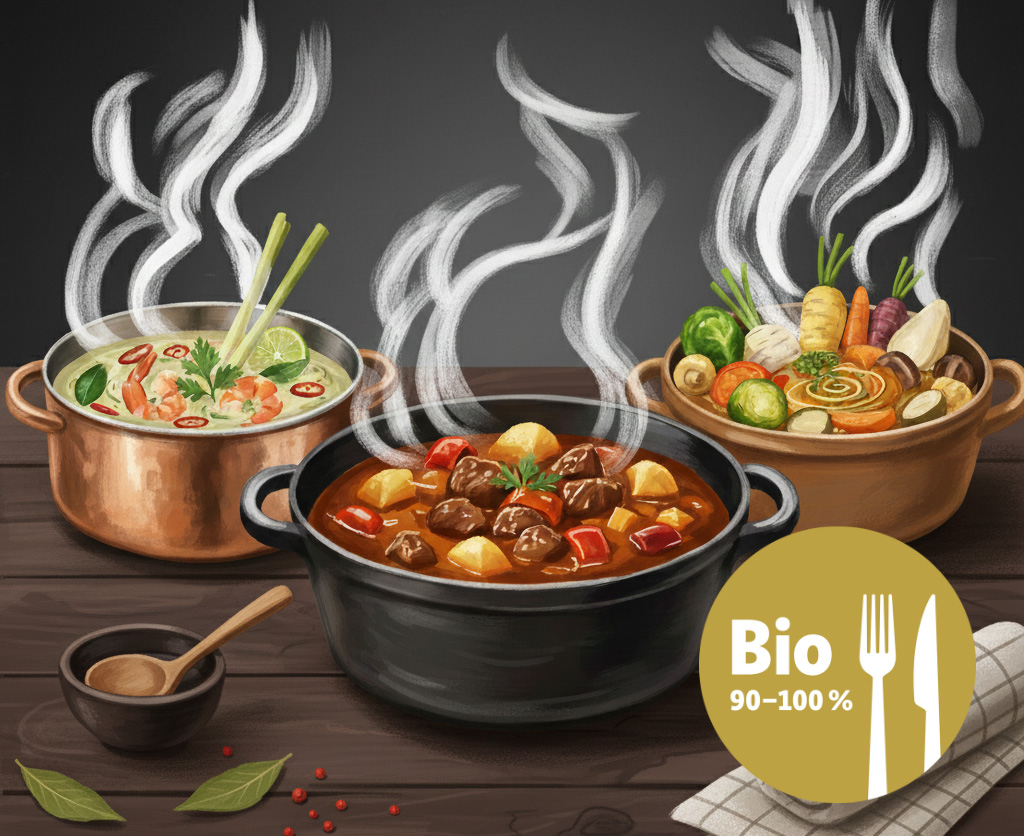 Ob herzhafter Paprika-Hot-Pot vom Rind, ein aromatischer Thai-Kokos-Hot-Pot mit Garnelen und Hühnchen, ein afrikanisch gewürzter Lamm-Hot-Pot mit Auberginen und Tagliatelle oder eine vegetarische, saisonale Kreation – jeder Hot-Pot steht für ehrliche Küche, hochwertige Zutaten und liebevolle Zubereitung – wie immer meist alles in Bio-Qualität.